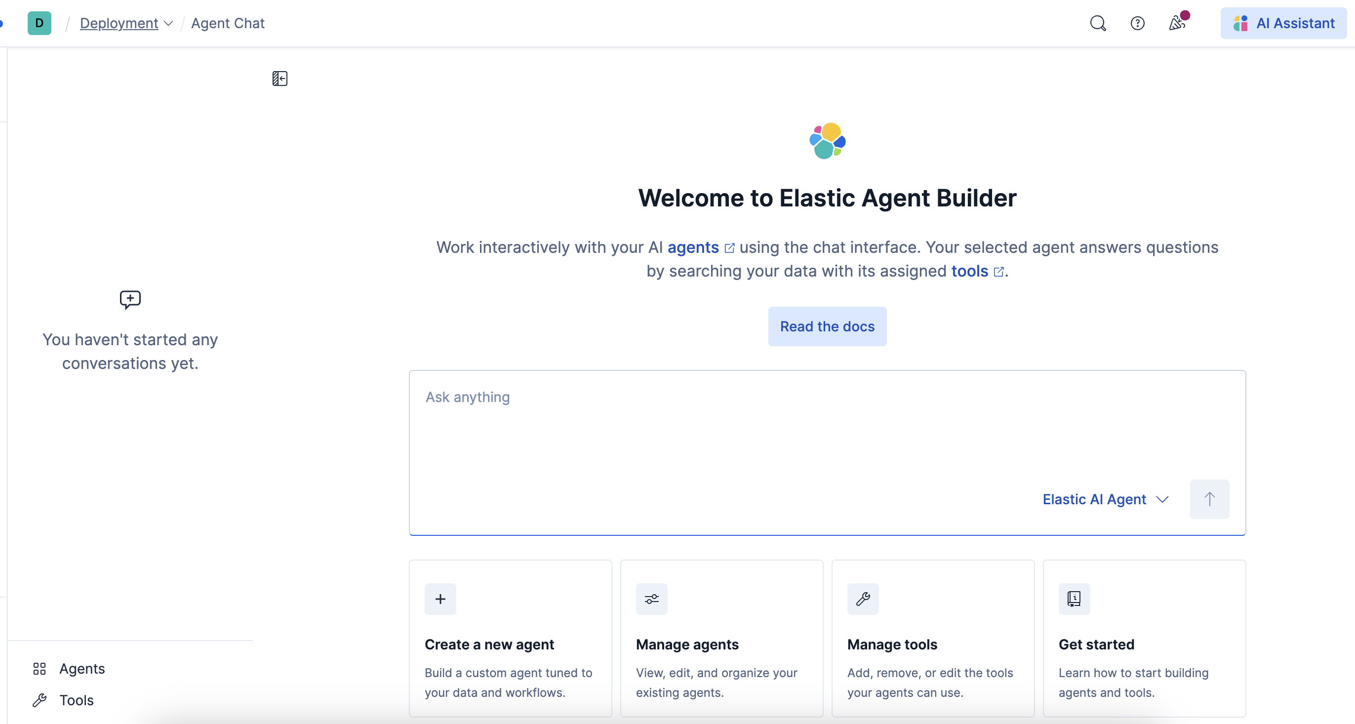 Once the feature is enabled, find Agents in the navigation menu to begin chatting. You can also search for Agent Builder in the global search bar.