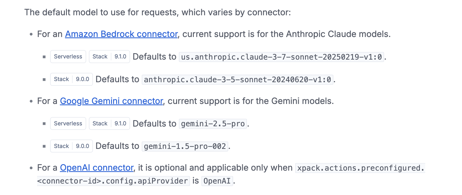 This might include labeling just one of multiple paragraphs, or one item in an ordered or unordered list. For example, on the Google Gemini Connector page, the default model is different depending on the deployment type and version of the Elastic Stack. These differences should be called out with their own applies_to badges.