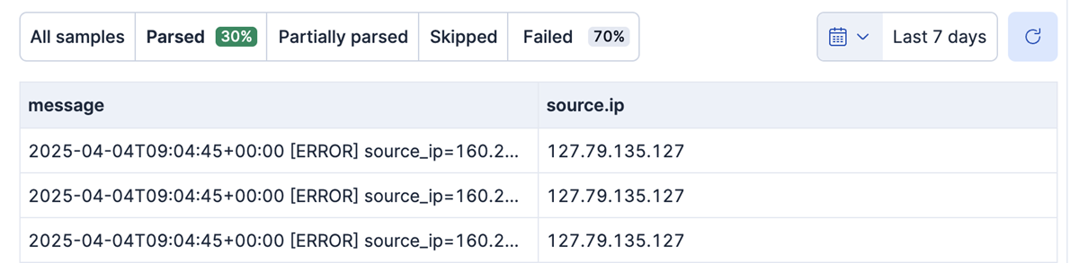 In the following screenshot, the Failed percentage indicates that some messages didn't match the provided grok pattern: