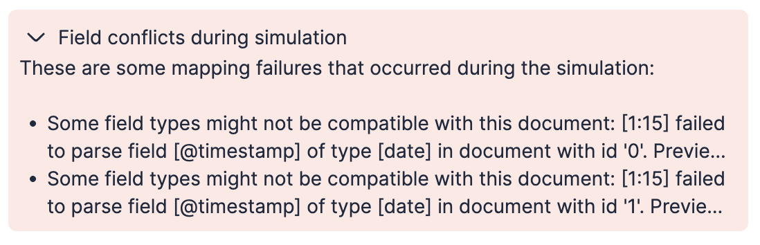 As part of processing, Streams simulates your changes end to end to check for mapping conflicts. If it detects a conflict, Streams marks the processor as failed and displays a message like the following: