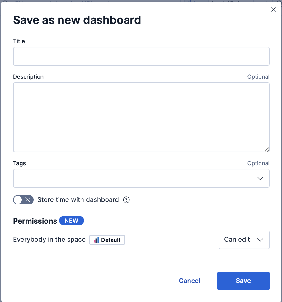 • Can view: Everybody in the space can view the dashboard, but cannot edit or delete it. They can duplicate it. This read-only setting can be changed at any time by the dashboard owner or a Kibana administrator.