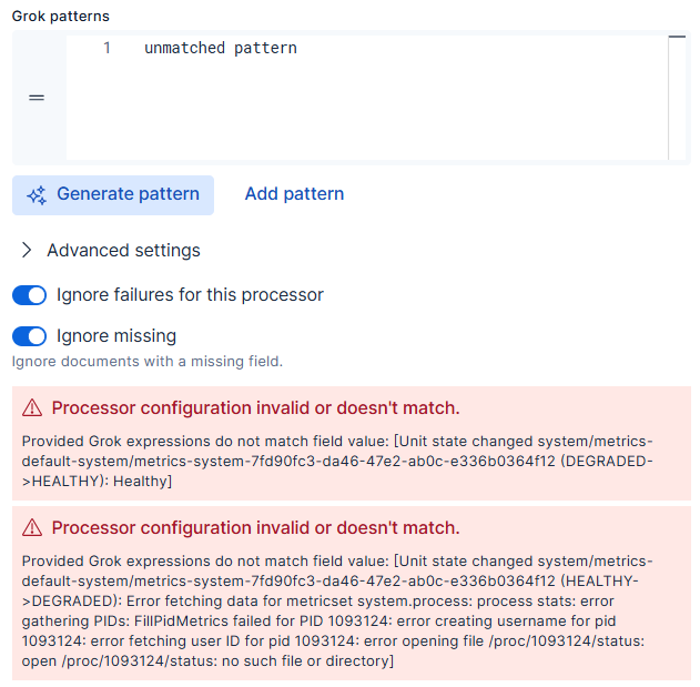 Dissect, grok, and rename processors include the Ignore missing fields option. When enabled, document processing continues even if a source field is missing.