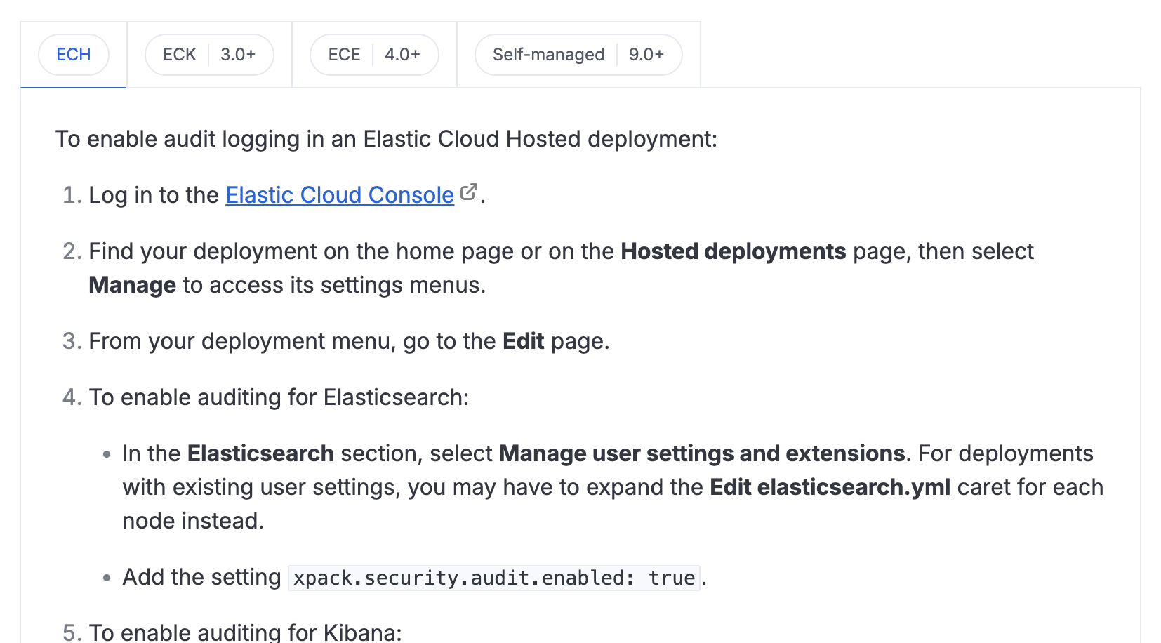 Example: On the Enable audit logging page, we use applies switch tabs to show separate ordered lists outlining the workflow for each deployment type.