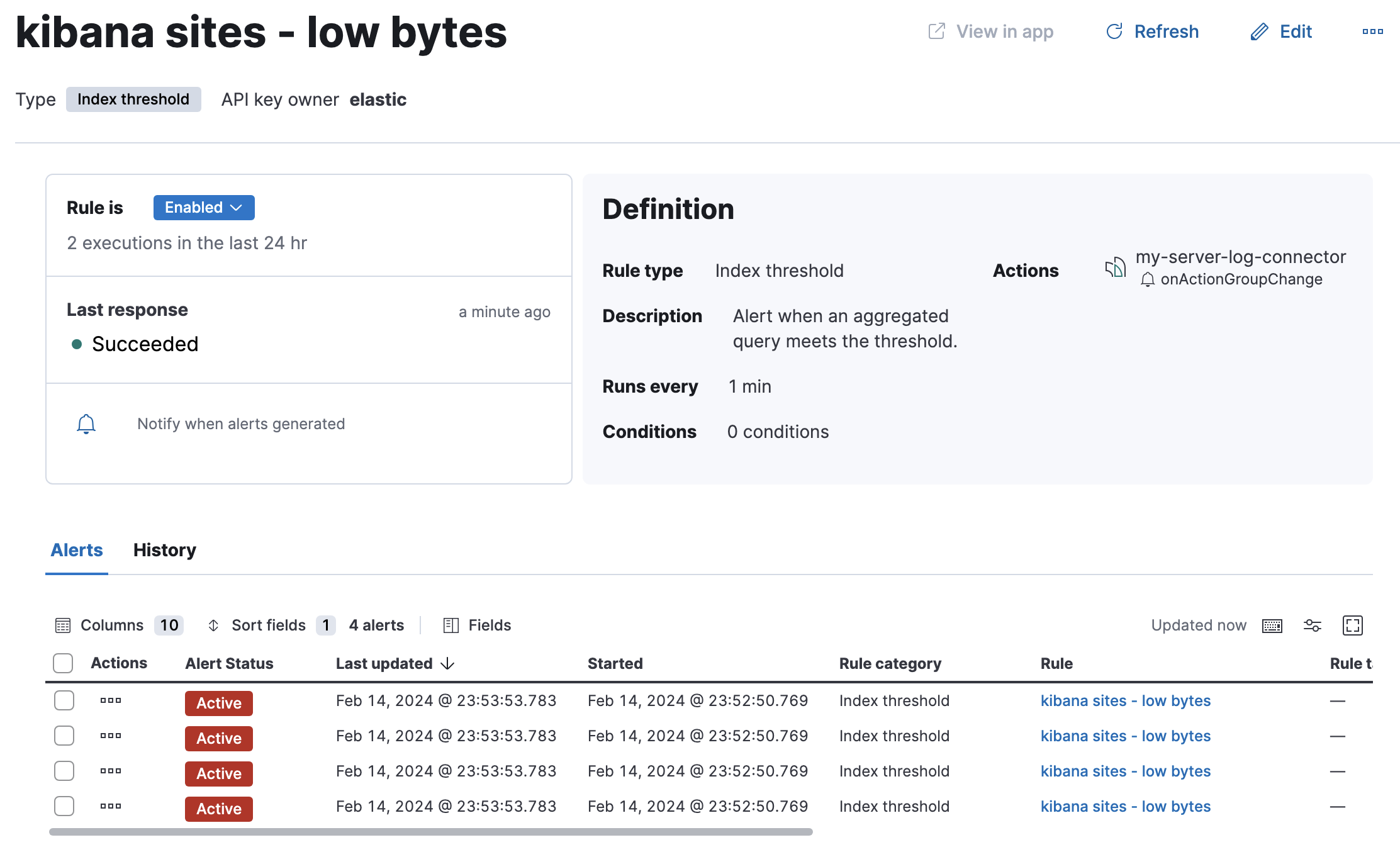 In this example, the rule detects when a site serves more than a threshold number of bytes in a 24 hour period. Four sites are above the threshold. These are called alerts - occurrences of the condition being detected - and the alert name, status, time of detection, and duration of the condition are shown in this view. Alerts come and go from the list depending on whether the rule conditions are met. For more information about alerts, go to View alerts.