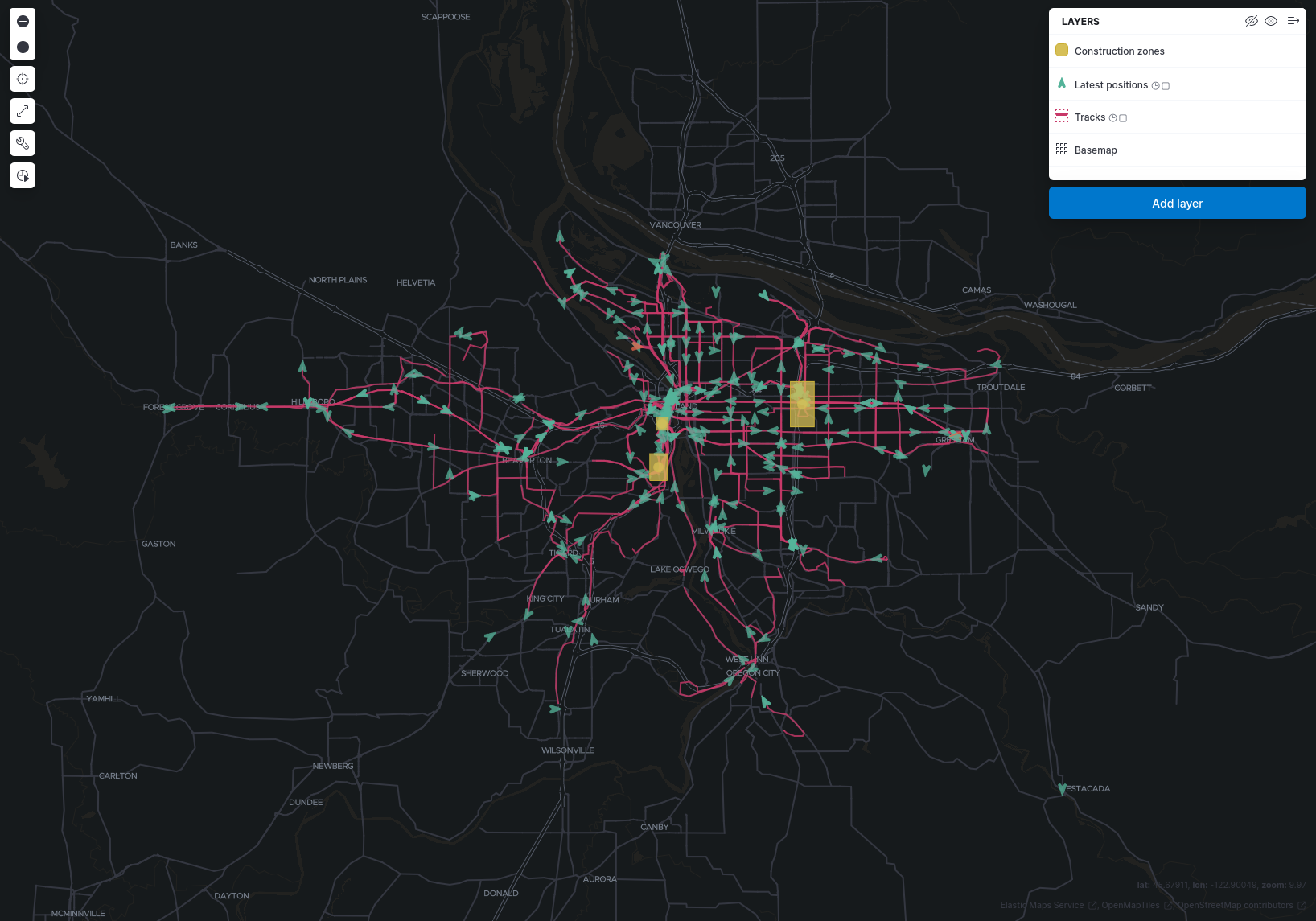 With the alert configured and running, in a few minutes your trimet_alerts index should start getting data. You can add this data to the operational map easily: