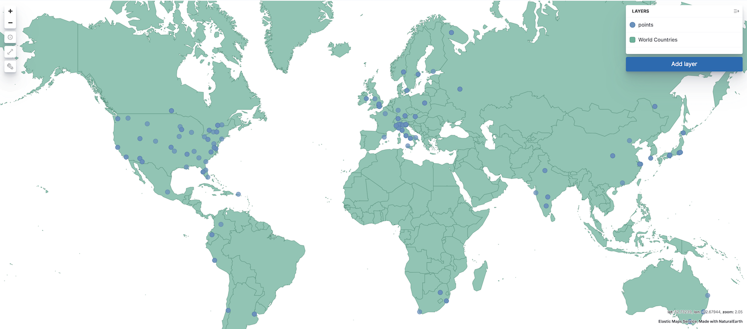 - The layer displays the most relevant documents per entity. The index must contain at least one field mapped as geo_point or geo_shape.