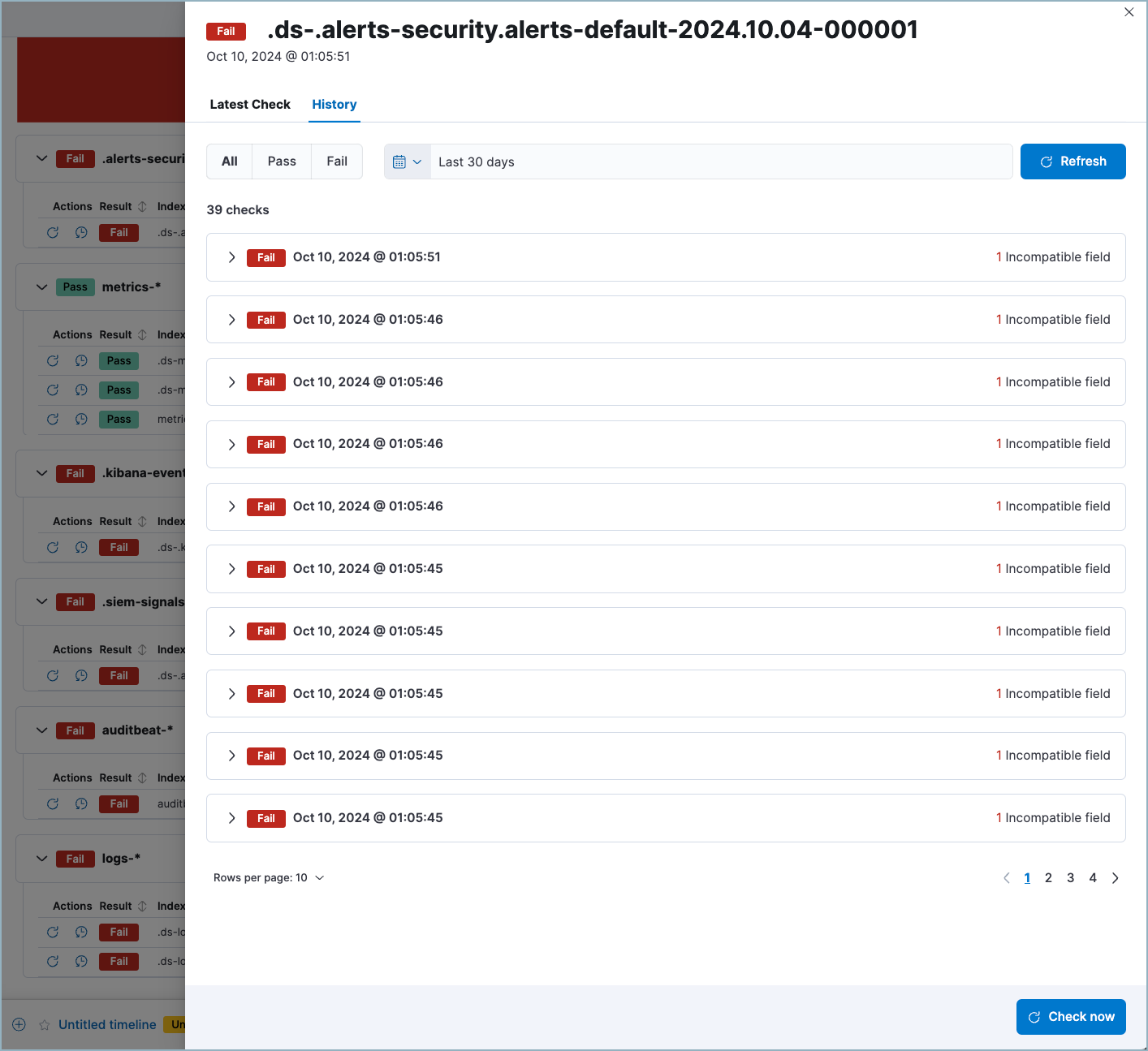 You can review an index’s data quality history by clicking View history under Actions, or by clicking the History tab in the details flyout. You can filter the results by time and Pass / Fail status. Click a historical check to expand it and view more details.