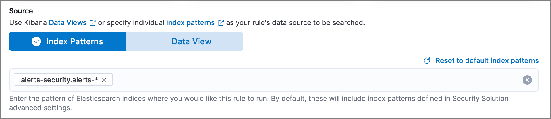 To create a rule that searches alert indices, select Index Patterns as the rule’s Source and enter the index pattern for alert indices (.alerts-security.alerts-*):