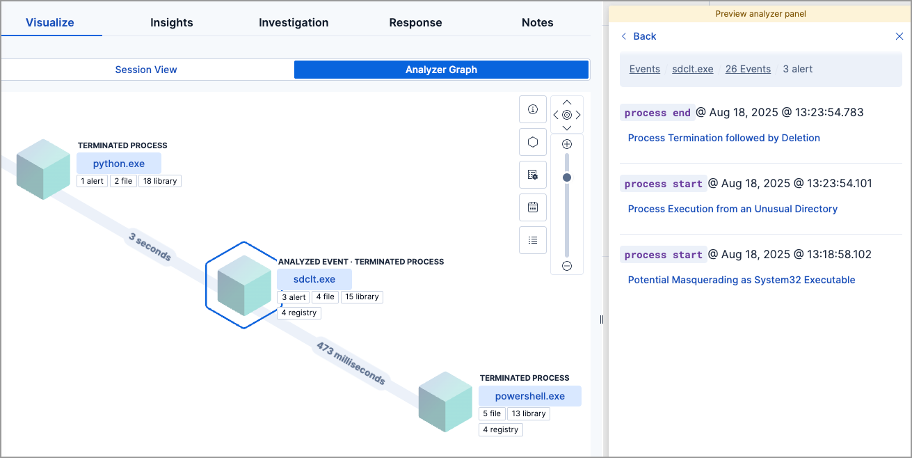 To learn more about each related process, select the process in the preview analyzer panel or the Analyzer Graph view. The preview analyzer panel then displays process details such as: