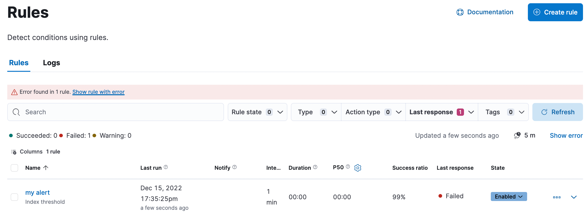 Rule management page with the errors banner