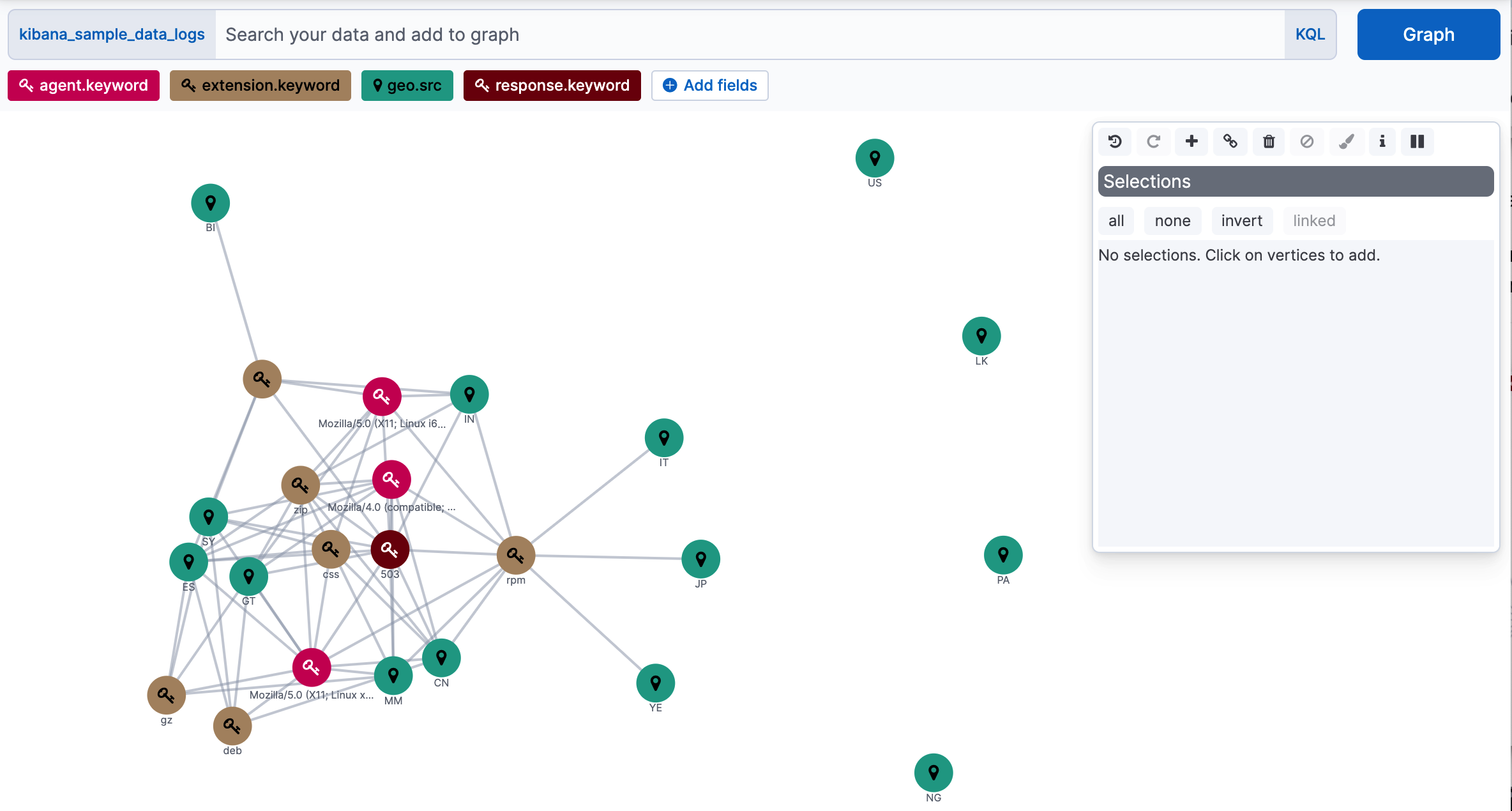 geo.srcfield. The weight of the connection between two vertices indicates how strongly they are related.To view more information about a relationship, click any connection or vertex.