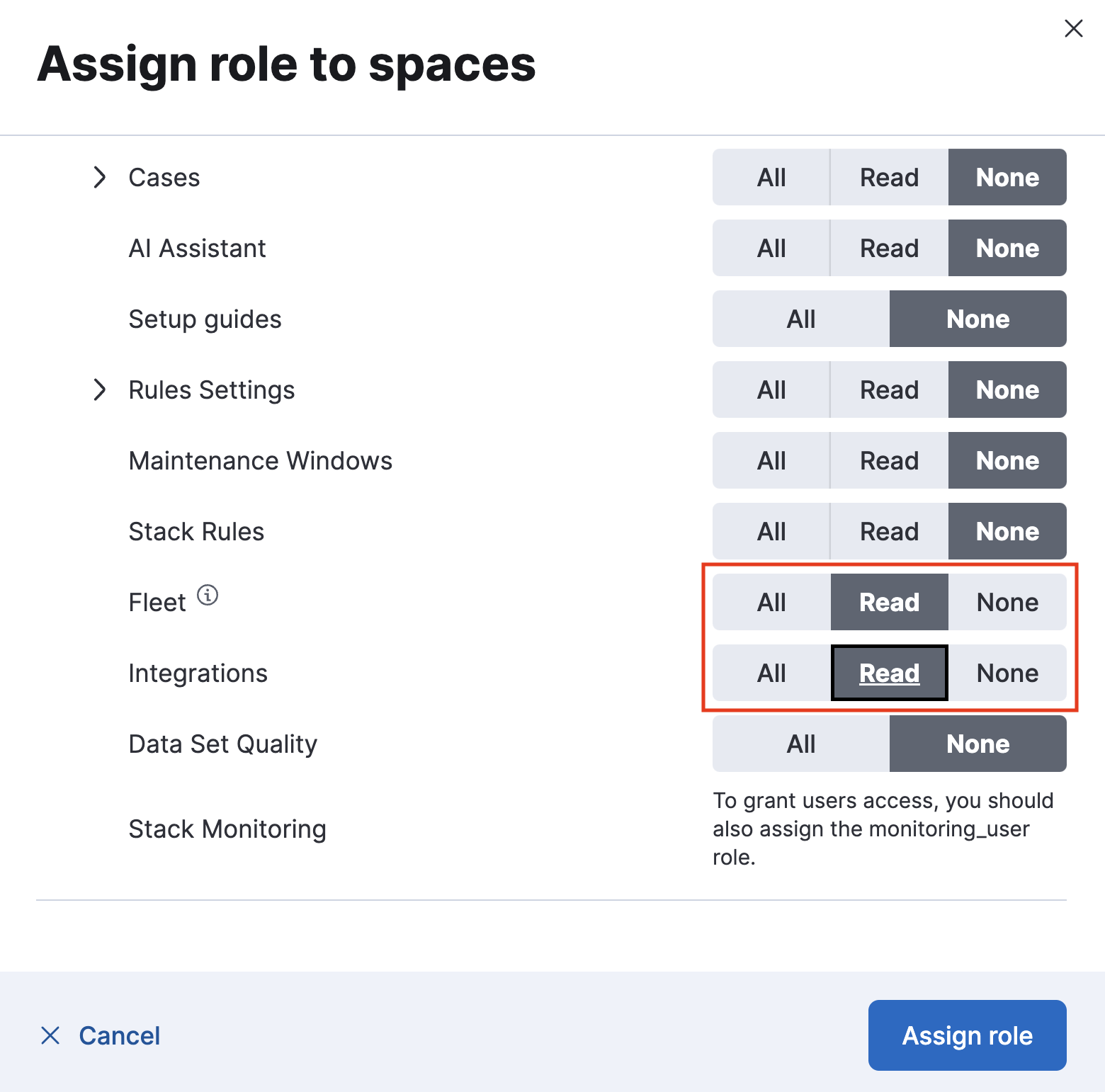 Use Kibana roles and privileges to grant users access to Fleet and Integrations. Fleet and integrations privileges can be set to:
