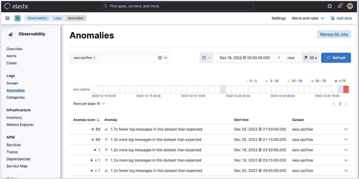 • Elastic Observability’s anomaly feature to identify anomalies in the logs