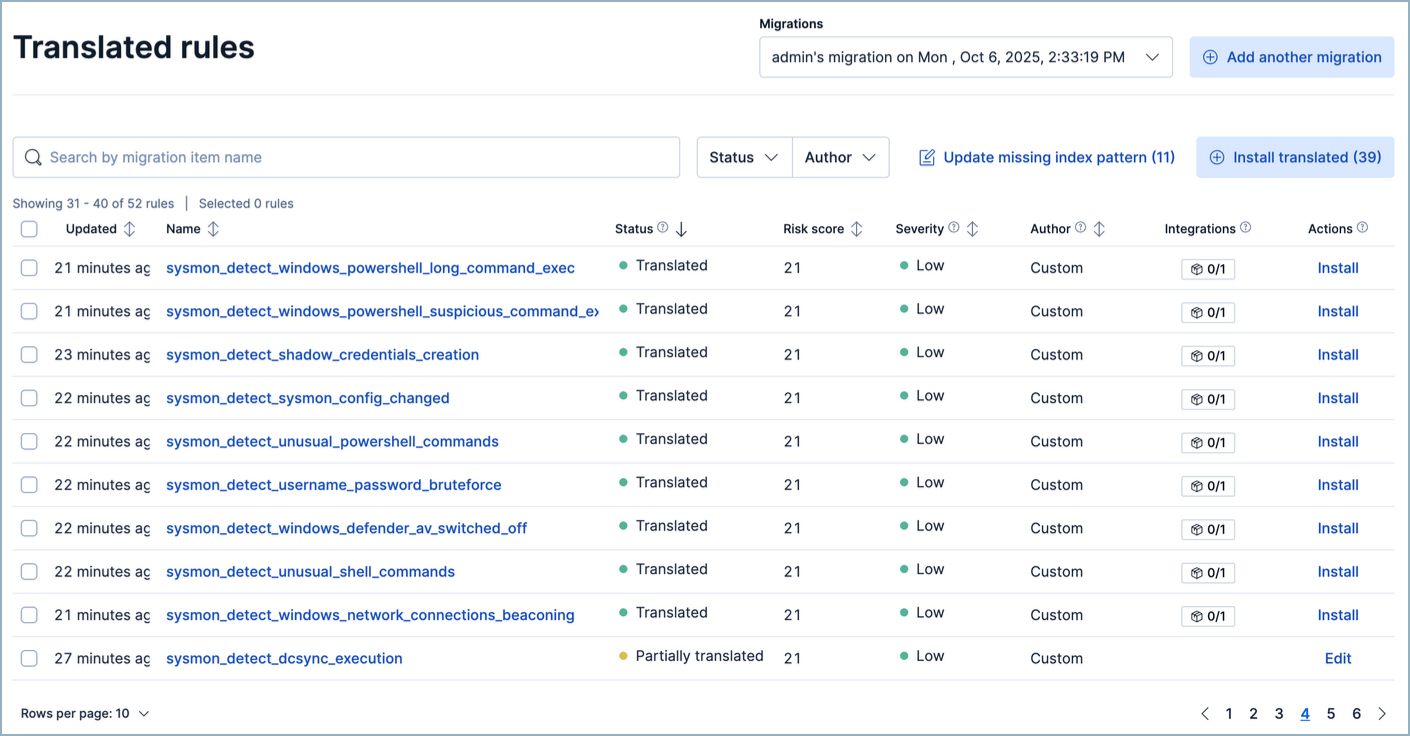 Installed: Already added to Elastic SIEM. Click View to manage and enable it.Translated: Ready to install. This rule was mapped to an Elastic-authored rule, or translated by Automatic Import. Click Install to install it.Partially translated: Part of the query could not be translated. You may need to specify an index pattern for the rule query, upload missing macros or lookups, or fix broken rule syntax.NoteTo fix partially translated rules that are missing an index pattern, use the Update missing index pattern button. This affects all migrated assets that contain the placeholder