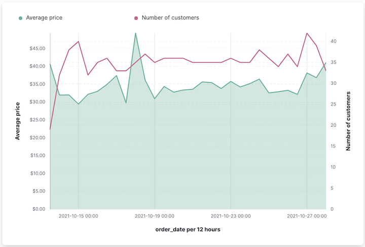 To analyze multiple visualization types, create an area chart that displays the average order prices, then add a line chart layer that displays the number of customers.