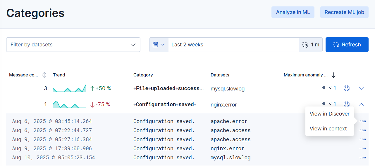 To view a log message for a particular category, click the arrow at the end of the row. To further examine it, click View in Discover or View in context