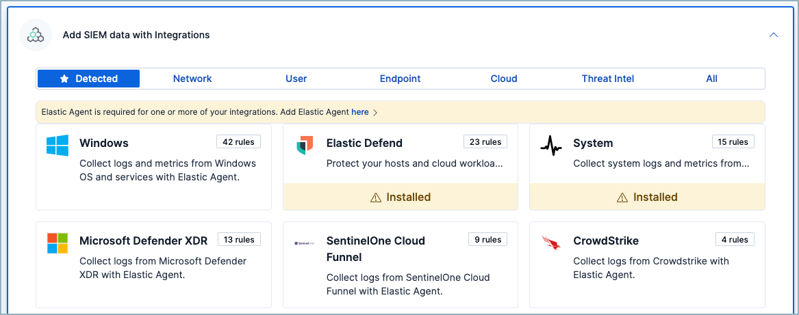 Use the Add SIEM data with Integrations section to set up data ingestion from third-party sources. If at least one rules migration has completed, the Recommended tab shows integrations that provide the data needed by your translated rules. These include both Elastic-managed integrations and any applicable custom integrations you made using automatic import.