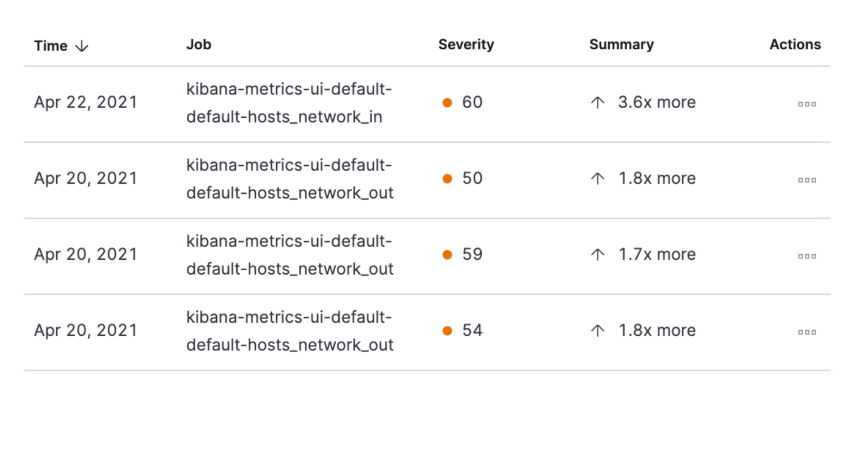 Along with the name of each anomaly job, detected anomalies with a severity score equal to 50 or higher are listed. These scores represent a severity of "warning" or higher in the selected time period. The summary value represents the increase between the actual value and the expected ("typical") value of the host metric in the anomaly record result.