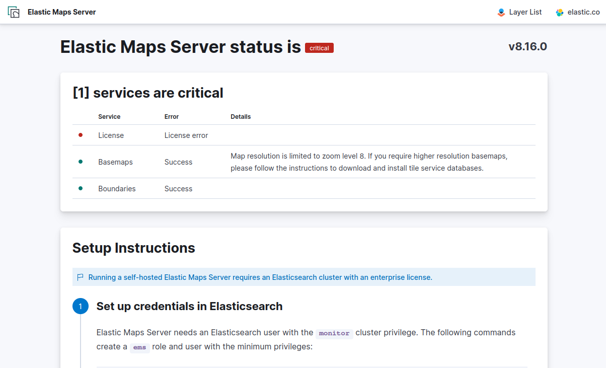 • At the root of Elastic Maps Server, a web page will render the status of the different services.
