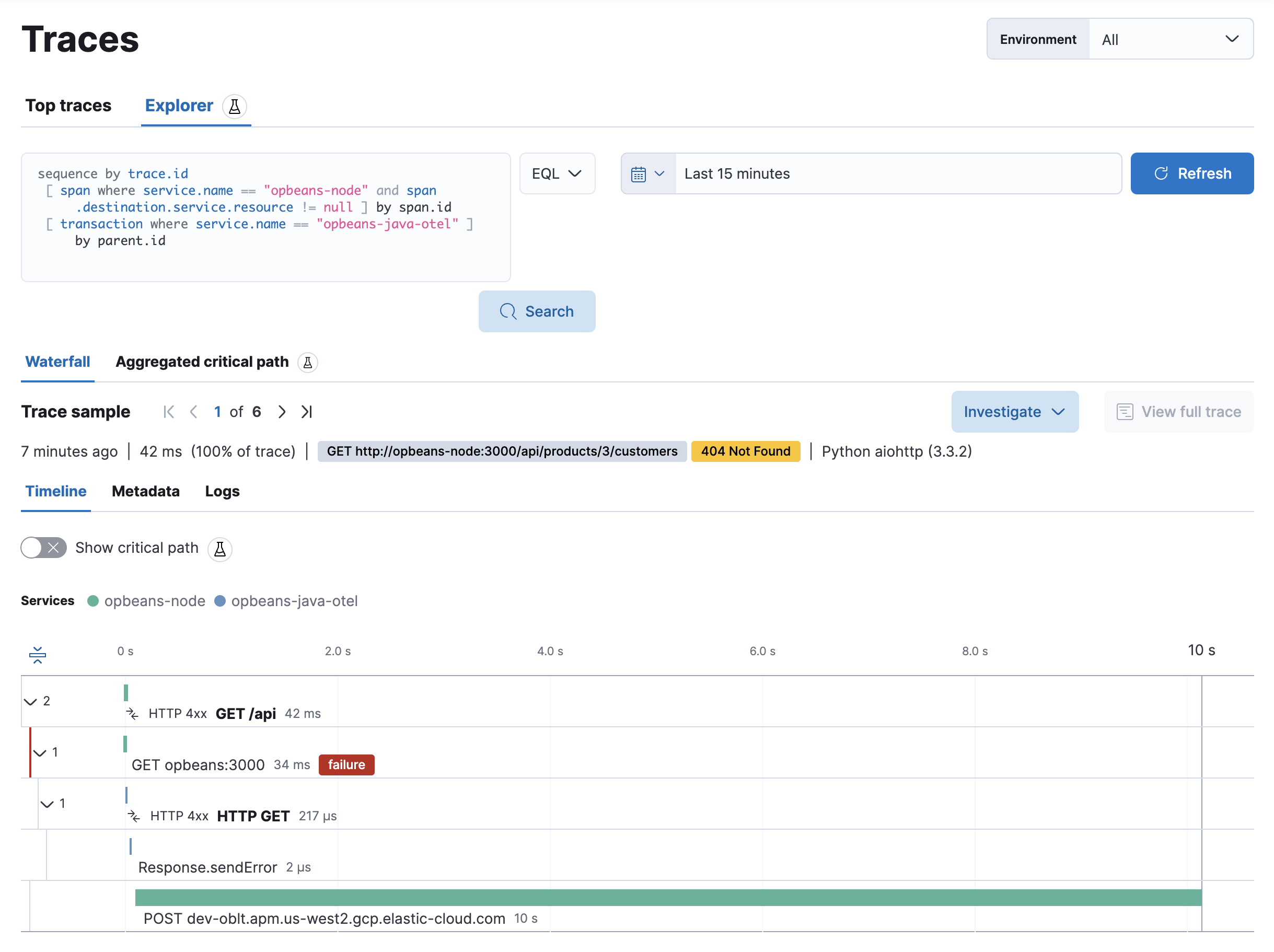 Trace explorer is an experimental top-level search tool that allows you to query your traces using Kibana Query Language (KQL) or Event Query Language (EQL).