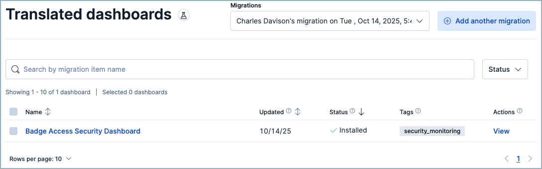 Installed: Already added to Elastic Security. Click View to manage it.Translated: Ready to install. Click Install to install it.Partially translated: Part of the dashboard could not be translated. Upload any missing macros or lookups, or fix broken syntax.Not translated: None of the original dashboard could be translated.Failed: Translation failed. Click the dashboard's name to open the details flyout and view error details.