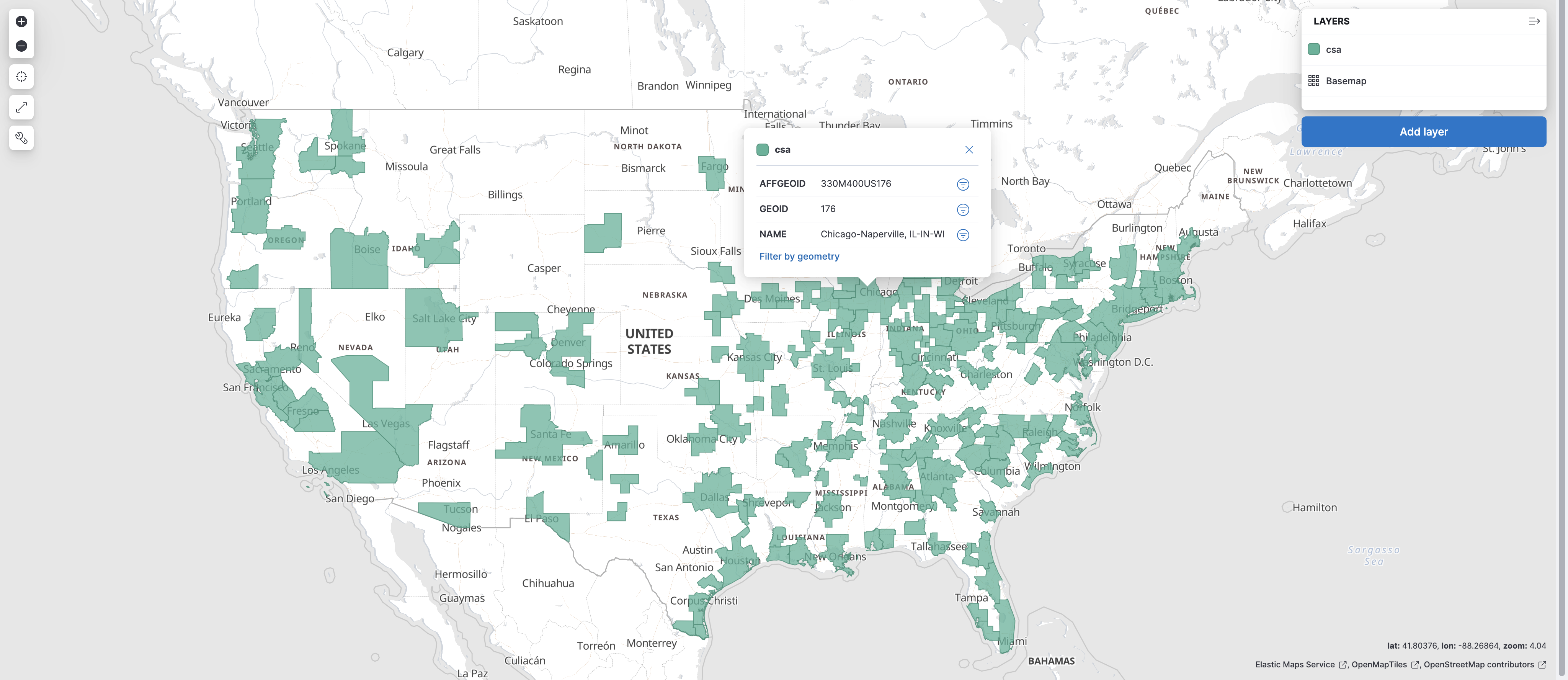 To visualize CSA regions by web log traffic, the web log traffic must contain a CSA region identifier. You’ll use Elasticsearch enrich processor to add CSA region identifiers to the web logs sample data set. You can skip this step if your source data already contains region identifiers.