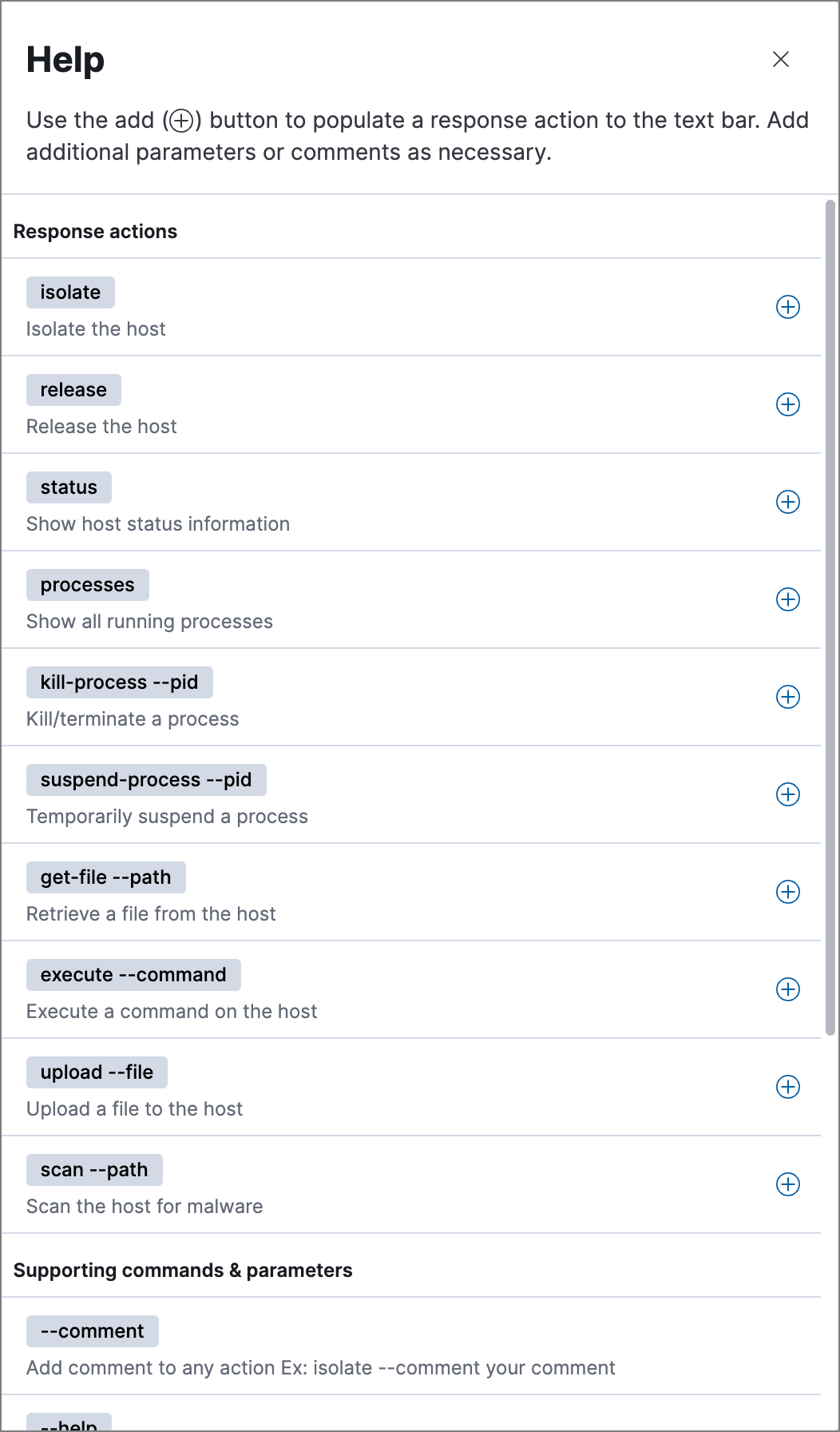 The response console allows you to perform response actions on an endpoint using a terminal-like interface. You can enter action commands and get near-instant feedback on them. Actions are also recorded in the endpoint’s response actions history for reference.