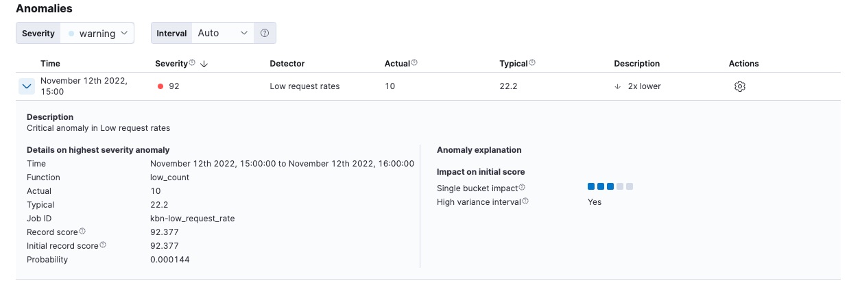 You might notice a high spike in the time series. It’s not highlighted as an anomaly, however, since this job looks for low counts only.