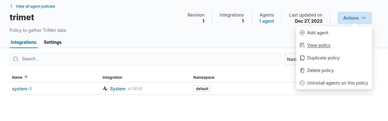 POST kbn:/api/fleet/agent_policies?sys_monitoring=true { "name": "trimet", "description": "Policy to gather TriMet data", "namespace": "default", "monitoring_enabled": ["logs", "metrics"], "inactivity_timeout": 1209600, "is_protected": false }Note the