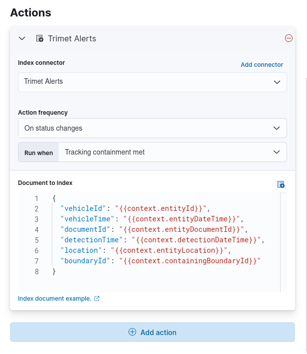 { "vehicleId": "{{context.entityId}}", "vehicleTime": "{{context.entityDateTime}}", "documentId": "{{context.entityDocumentId}}", "detectionTime": "{{context.detectionDateTime}}", "location": "{{context.entityLocation}}", "boundaryId": "{{context.containingBoundaryId}}" }