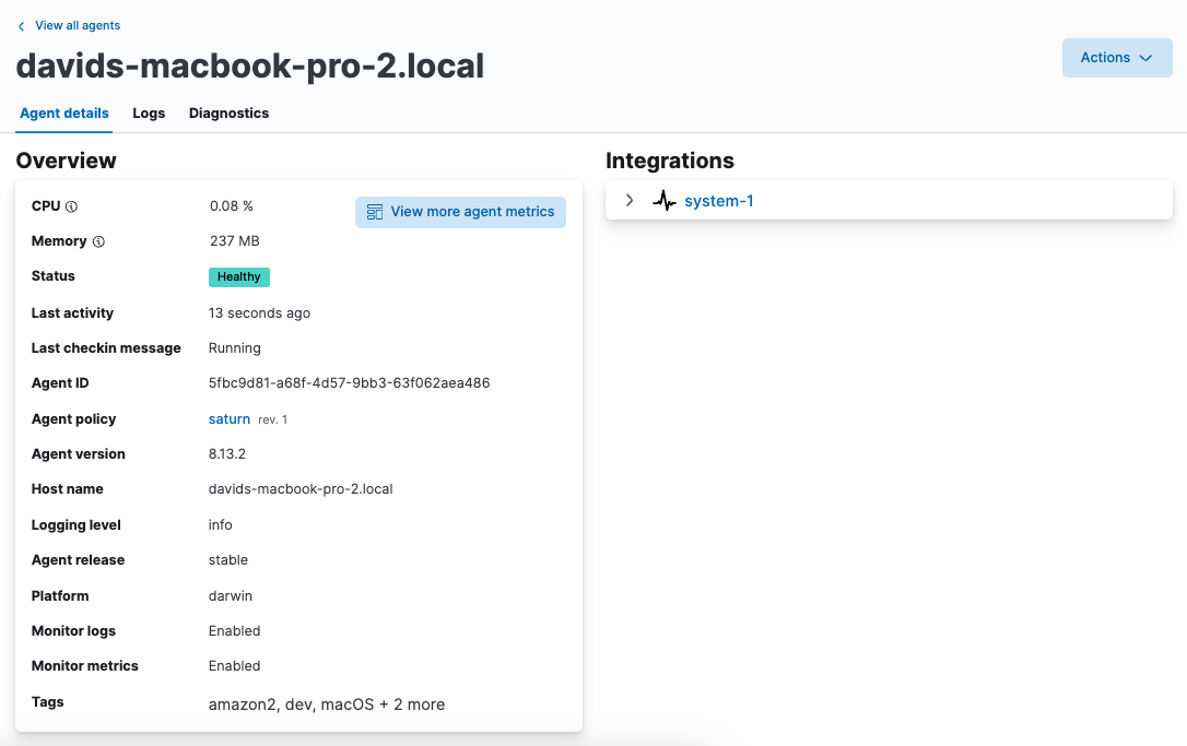 3. Go back to Fleet > Agents and verify that the agent status is still healthy. Click the host name to drill down into the agent details. From there, you can see the agent policy and integration policies that are applied.