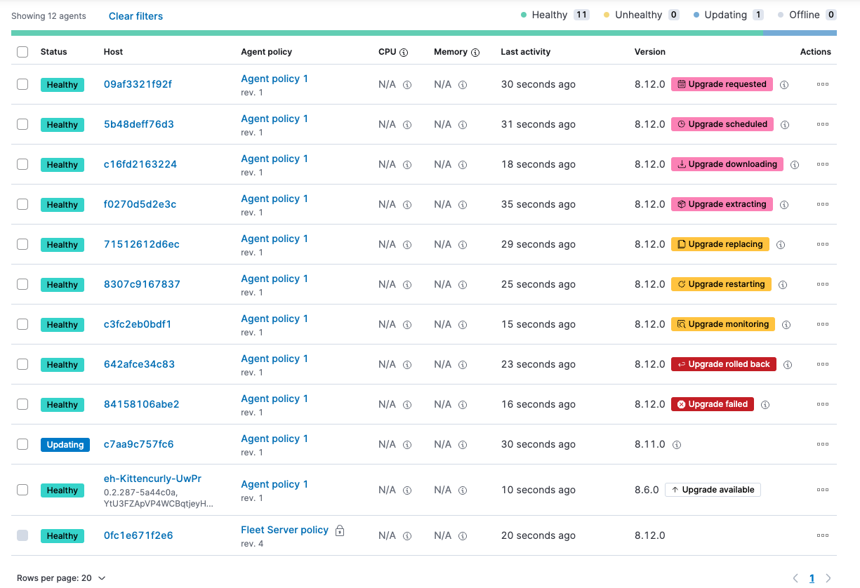 Under routine circumstances, an Elastic Agent upgrade happens quickly. You typically will not see the agent transition through each of the upgrade states. The detailed upgrade status can be a useful tool especially if you need to diagnose the state of an agent that may have become stuck, or appears to have become stuck, during the upgrade process.