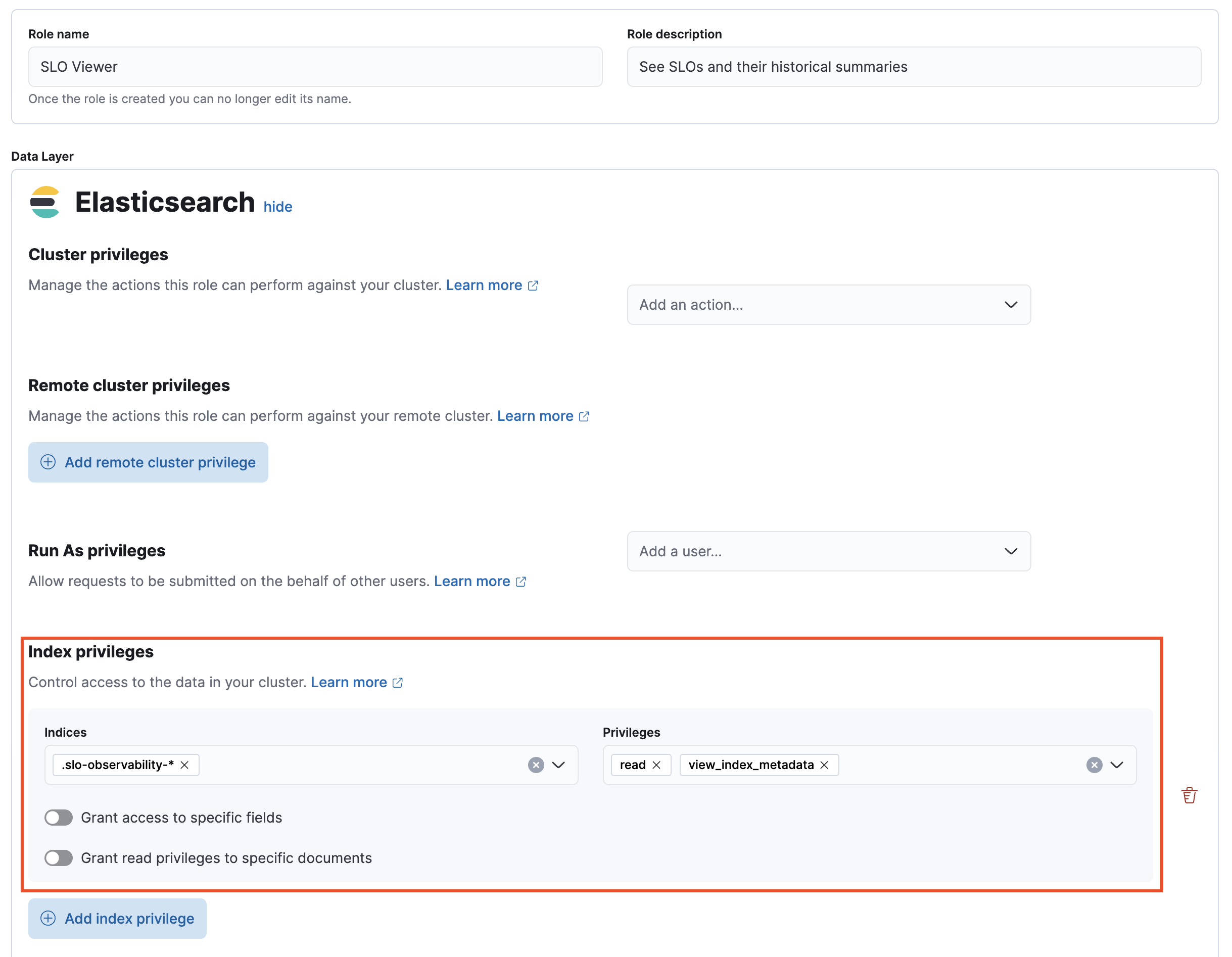 .slo-observability.*to the Indices field andreadandview_index_metadatato the Privileges field.