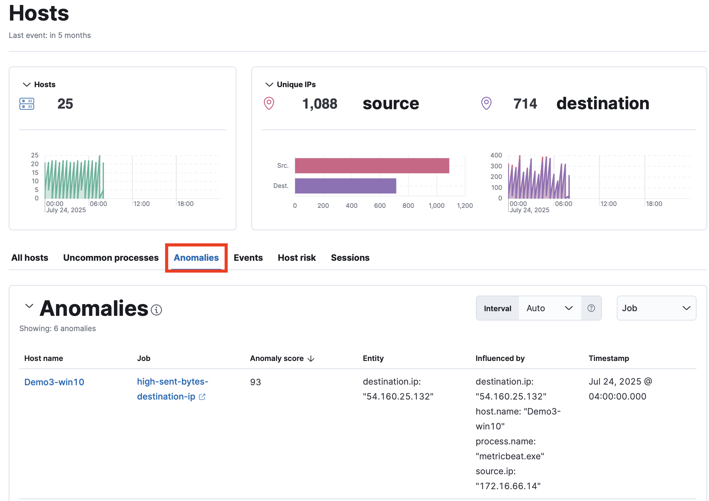 Anomaly detection jobs identify anomalous events or patterns in your data. In a security context, they’re typically used with detection rules to trigger alerts when behavior deviates from baseline activity.