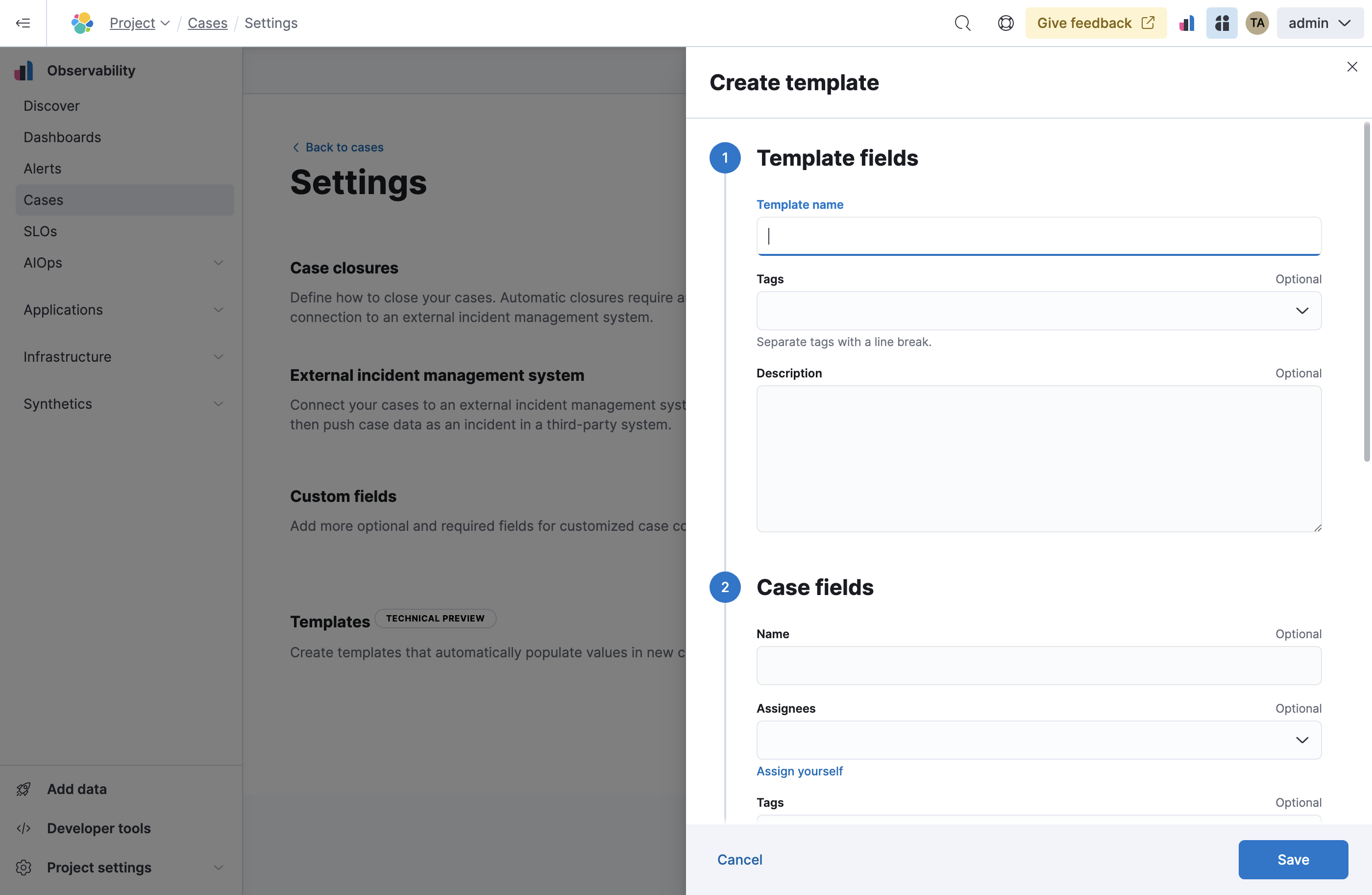 To change case closure options and add custom fields, templates, and connectors for external incident management systems, go to Cases → Settings.