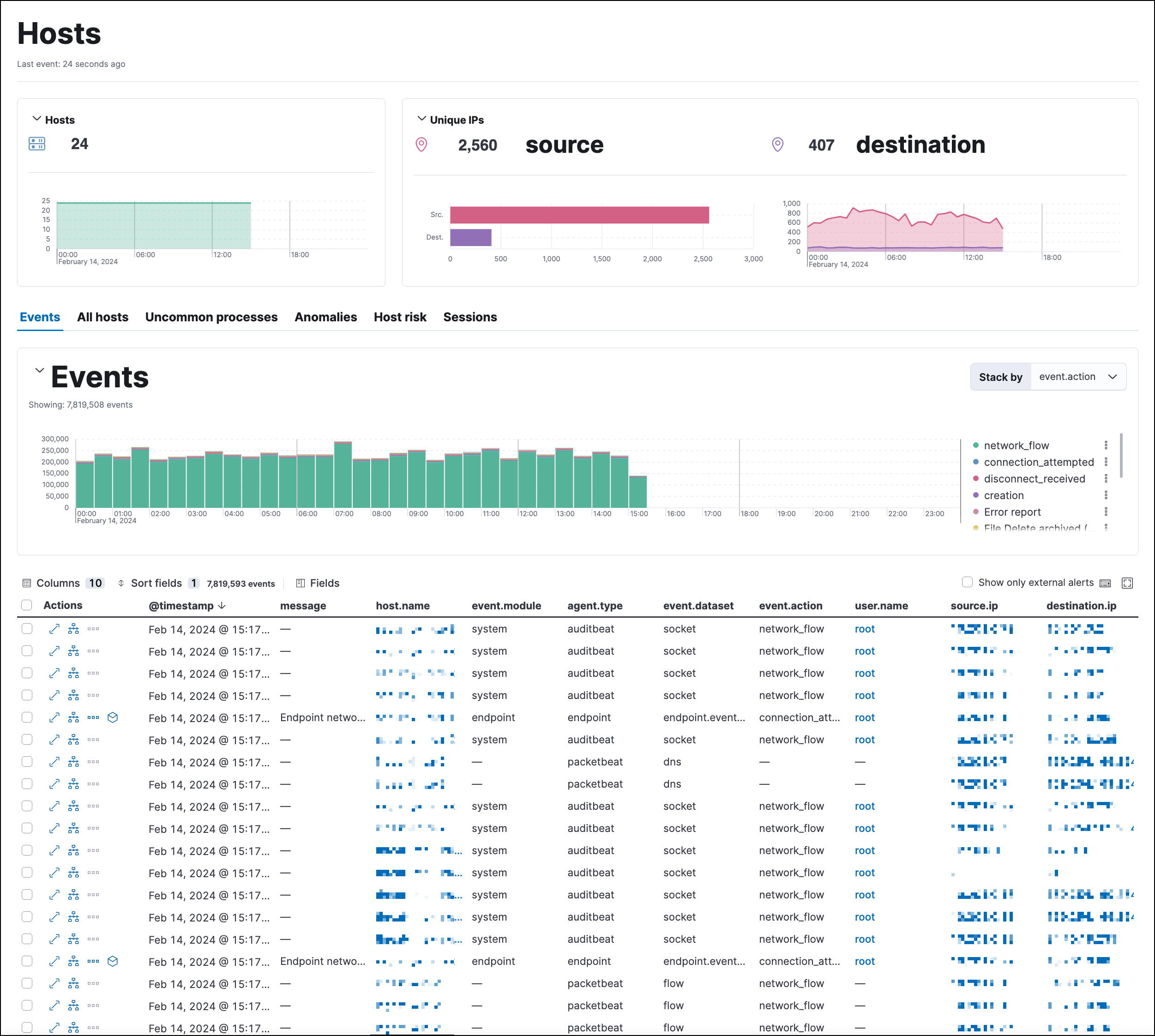 The Hosts page provides a comprehensive overview of all hosts and host-related security events. Key performance indicator (KPI) charts, data tables, and interactive widgets let you view specific data, drill down for deeper insights, and interact with Timeline for further investigation.