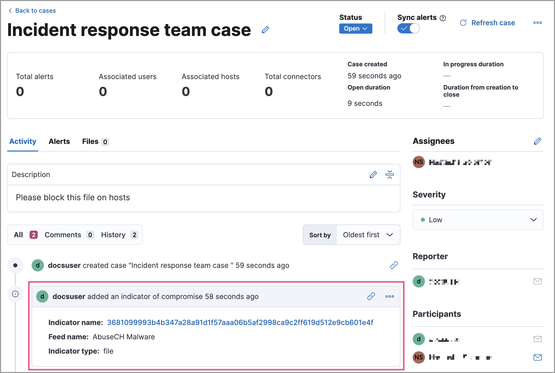Attaching indicators to cases provides more context and available actions for your investigations. This feature allows you to easily share or escalate threat intelligence to other teams.
