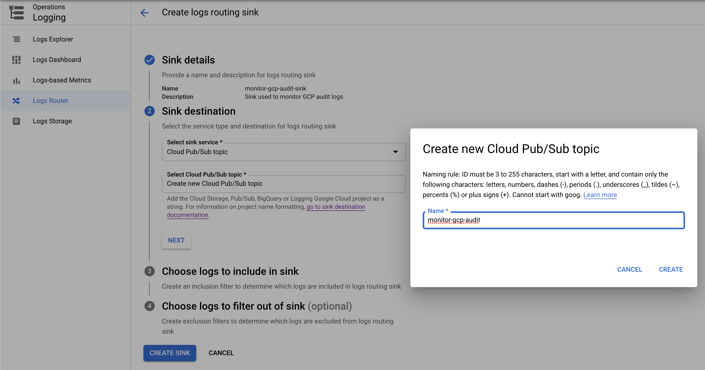 To set up the logs routing sink, click Create sink. Set sink name as monitor-gcp-audit-sink. Select the Cloud Pub/Sub topic as the sink service and Create new Cloud Pub/Sub topic named monitor-gcp-audit: