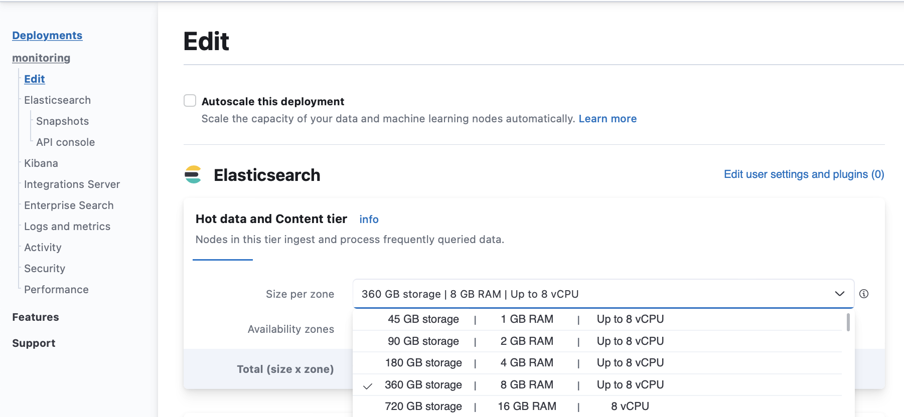From your deployment menu, go to the Edit page and increase the Size per zone for the data tiers identified at step 2.