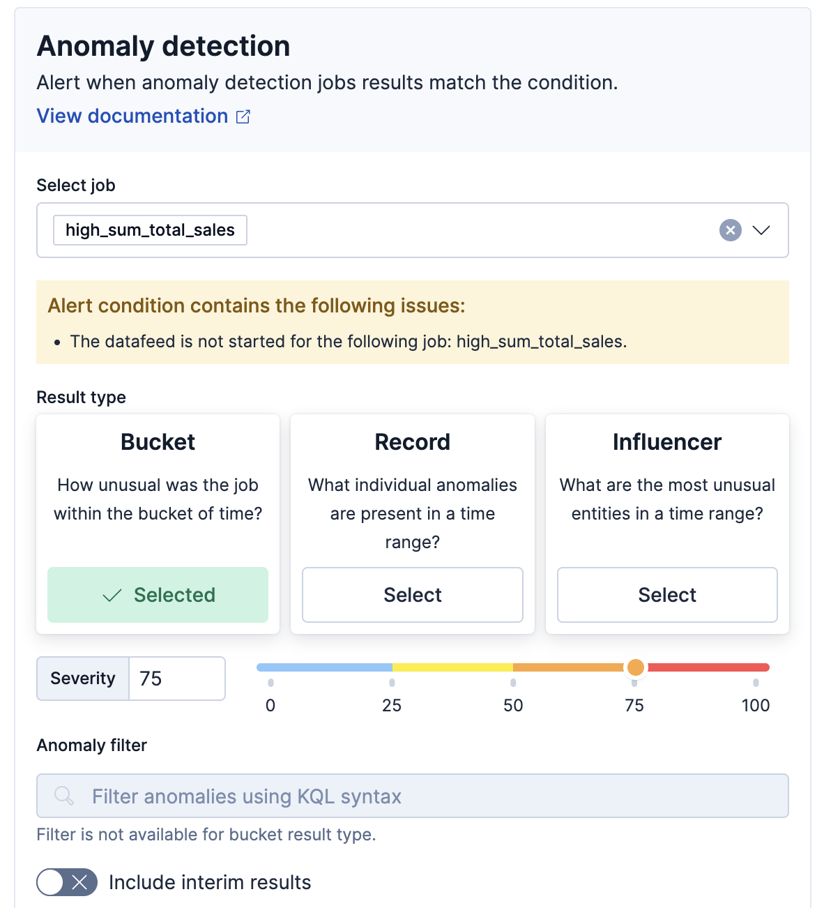 - Configure the Lookback interval to define how far back to query previous anomalies during each condition check. Its value is derived from the bucket span of the job and the query delay of the datafeed by default. It is not recommended to set the lookback interval lower than the default value, as it might result in missed anomalies.
