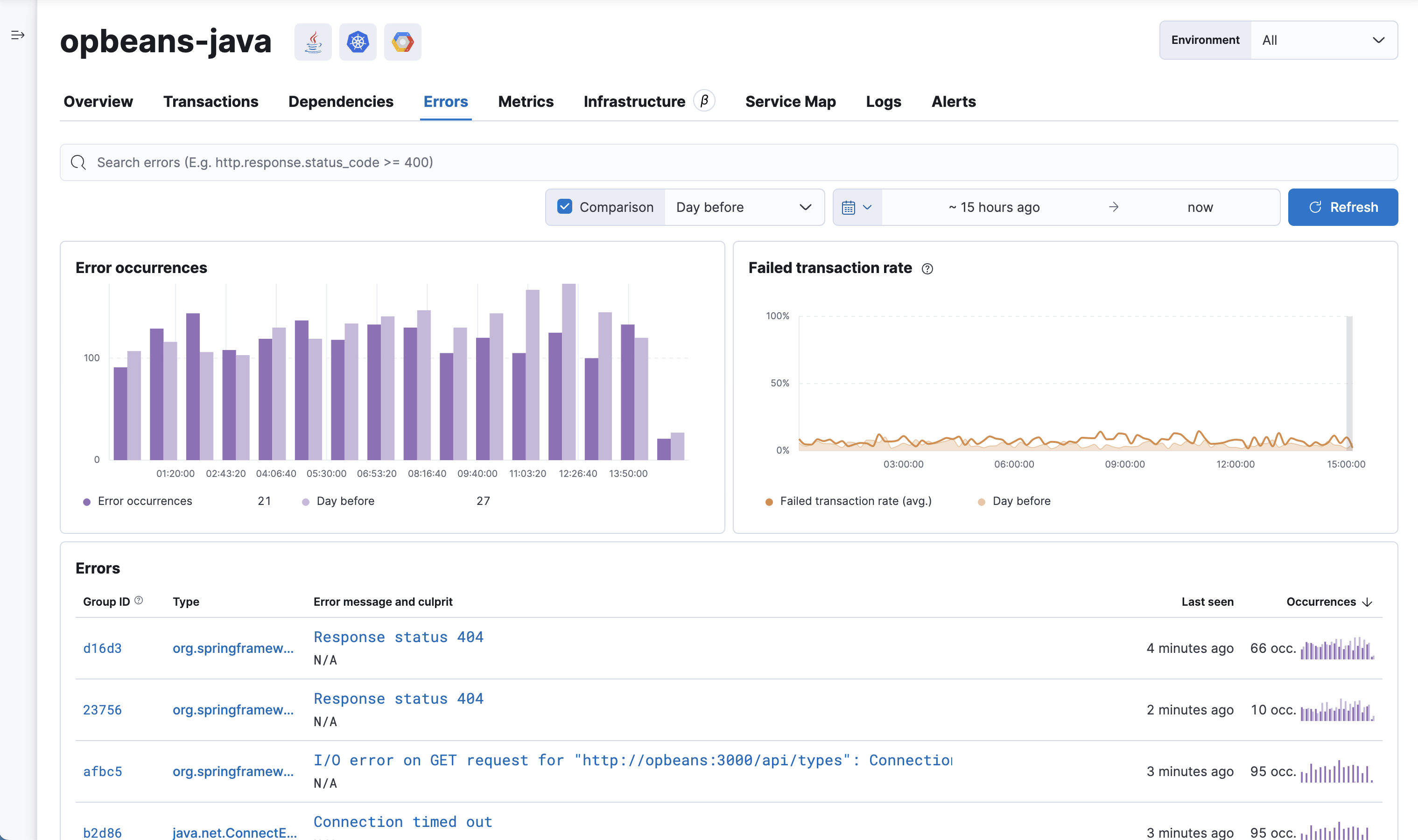 Errors are groups of exceptions with a similar exception or log message. The Errors overview provides a high-level view of the exceptions that APM agents catch, or that users manually report with APM agent APIs. Like errors are grouped together to make it easy to quickly see which errors are affecting your services, and to take actions to rectify them.