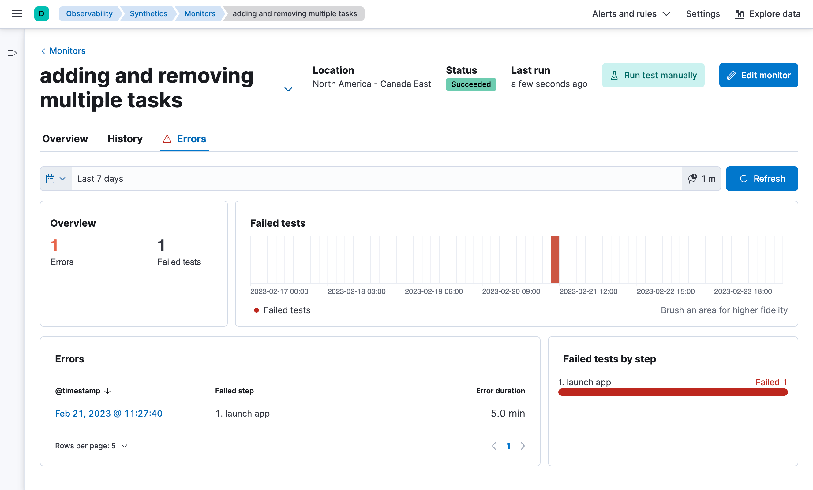 The Errors tab has information on failed runs. If the monitor is configured to retest on failure, failed runs will only result in an error if both the initial run and the rerun fail. This can reduce noise related to transient problems.