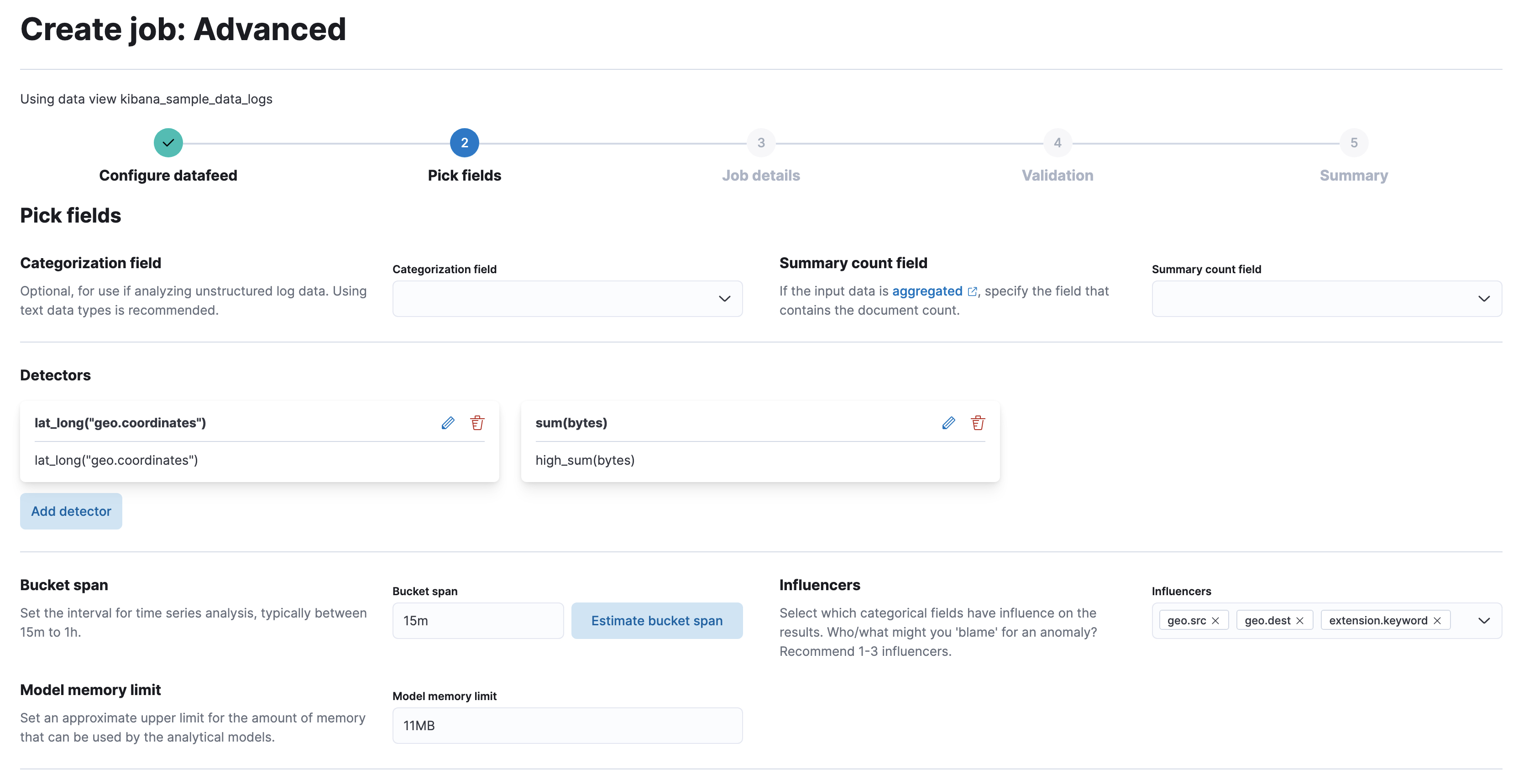 Alternatively, create a job that analyzes the sample web logs data set to detect events with unusual coordinates (geo.coordinates values) or unusually high sums of transferred data (bytes values):