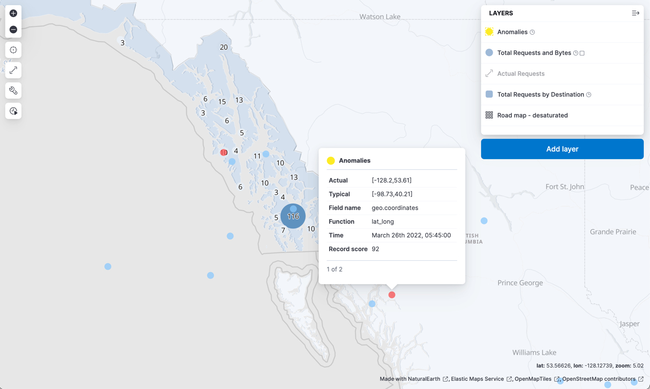 If your data includes geographic fields, you can use machine learning features to detect anomalous behavior, such as a credit card transaction that occurs in an unusual location or a web request that has an unusual source location.