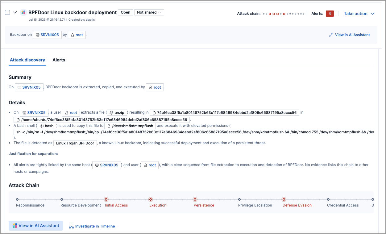 - Click View in AI Assistant to attach the discovery to a conversation with AI Assistant. You can then ask follow-up questions about the discovery or associated alerts.