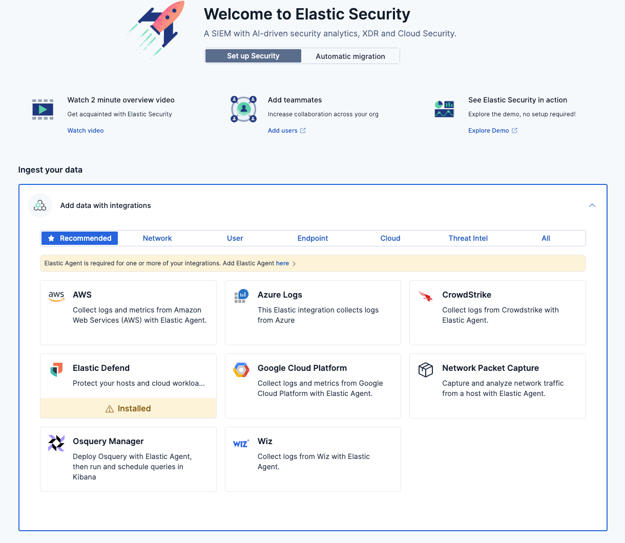 After you've deployed Elastic Security, the next step is to get data into the product before you can search, analyze, or use any visualization tools. The easiest way to get data into Elastic Security is through one of our hundreds of ready-made integrations. You can add an integration directly from the Get Started page within the Ingest your data section: