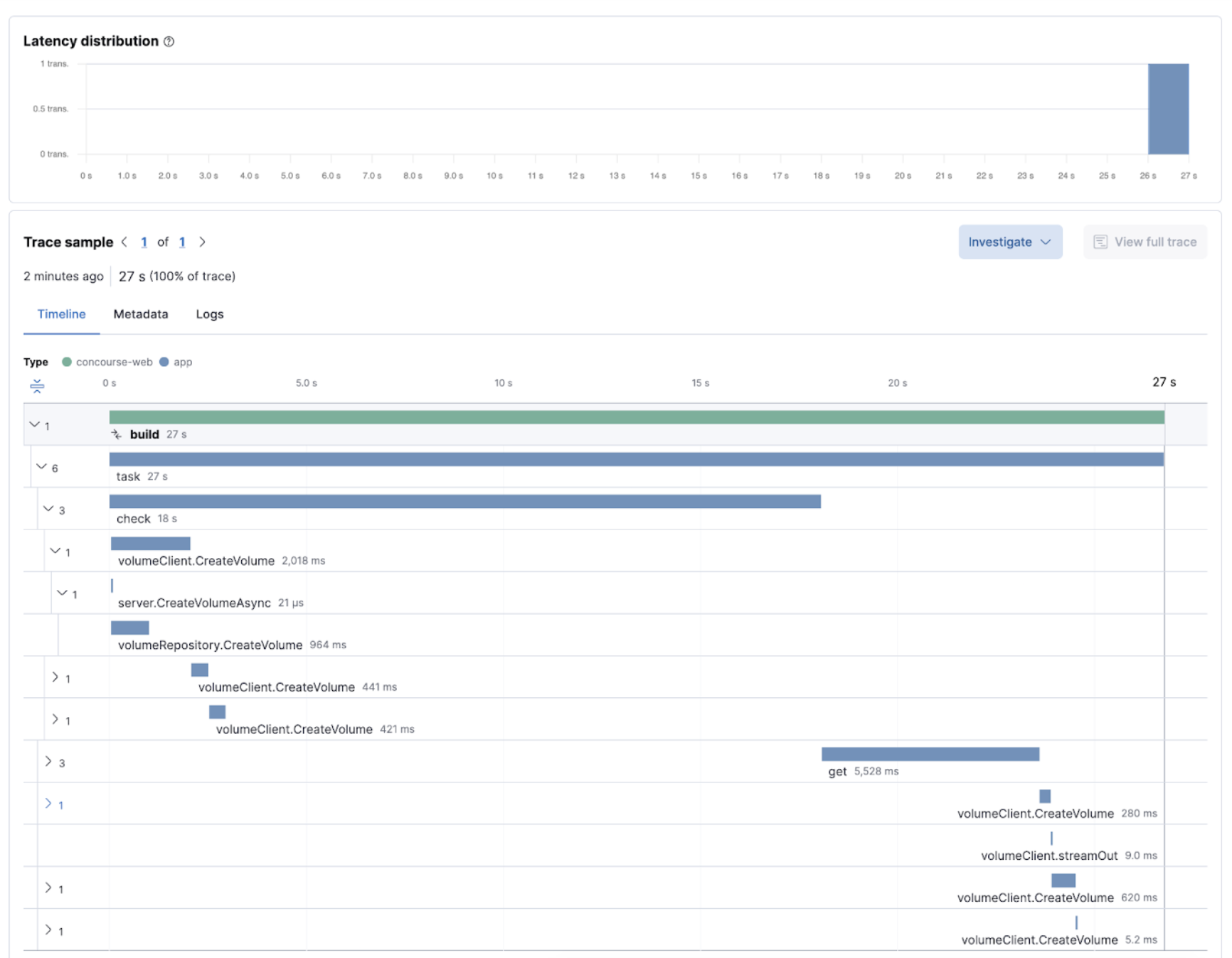 The pipelines and traditional jobs are instrumented automatically. If you spot a slow or failing build and need to understand what’s happening, you can drill into the trace view of the build to look for the high duration jobs or jobs with errors. You can then dig into the details to understand the source of the error.
