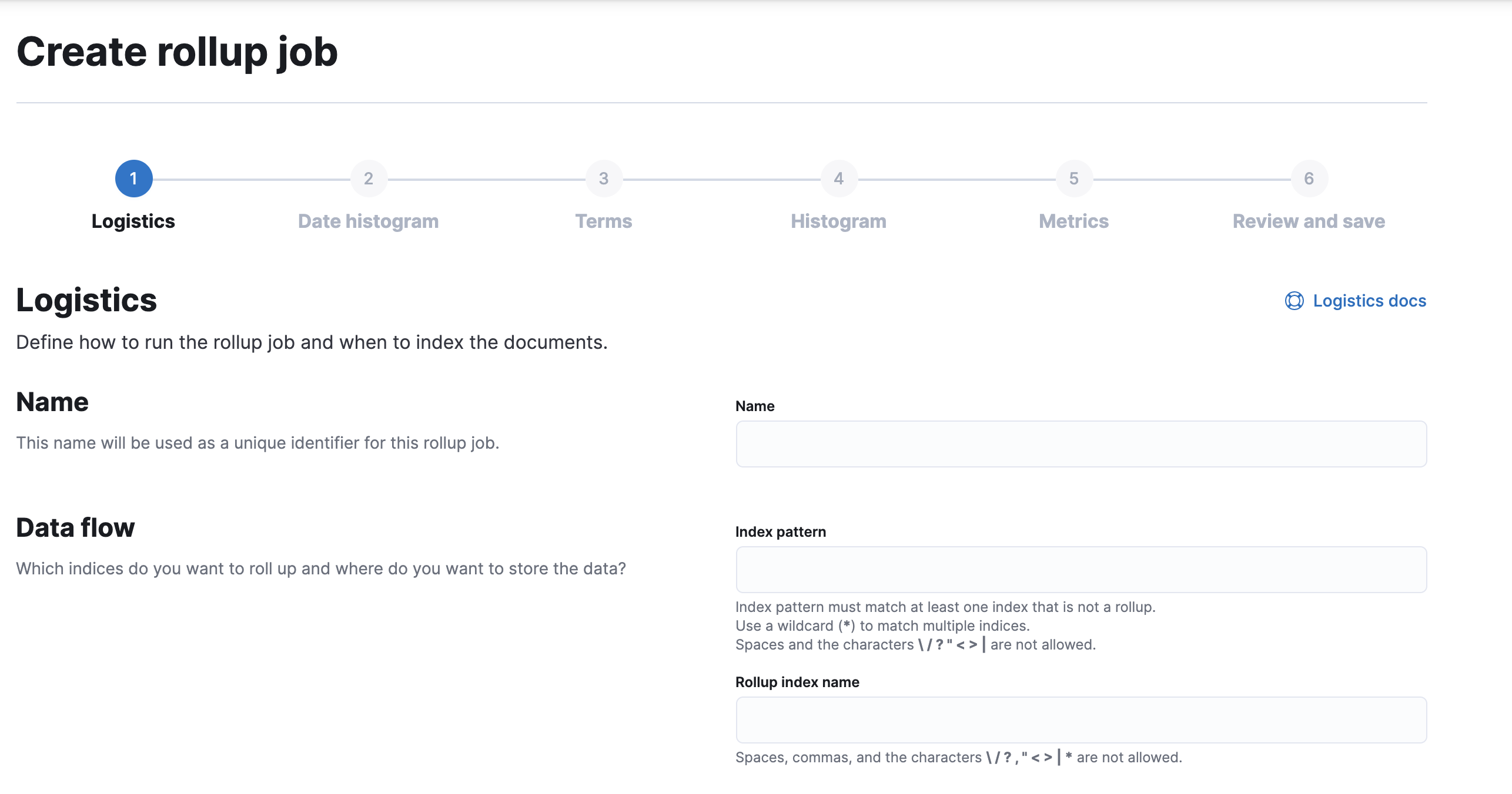 Kibana makes it easy for you to create a rollup job by walking you through the process. You fill in the name, data flow, and how often you want to roll up the data. Then you define a date histogram aggregation for the rollup job and optionally define terms, histogram, and metrics aggregations.