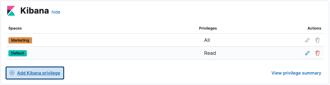To apply your changes, click Add Kibana privilege. The privilege shows up under the Kibana privileges section of the role.