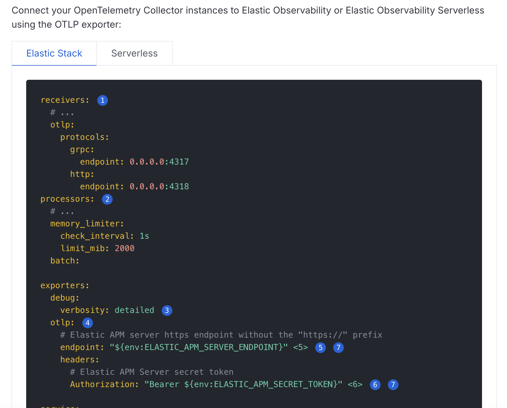 Example: On the Upstream OpenTelemetry Collectors and language SDKs page, we use tabs to show two different code blocks: one for Serverless and one for Elastic Stack (stateful).